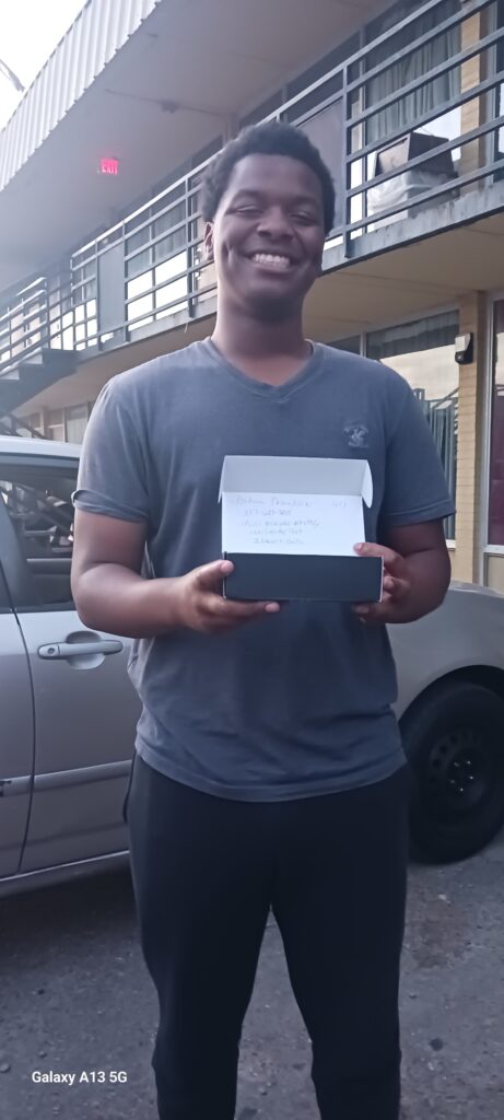 Joshua with his new phone, something required for his new job. Thanks to all who have donated cash to the Inn.