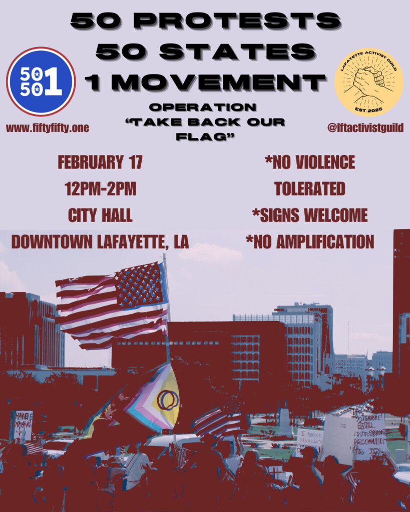 Members of the UU congregation are taking part in the 50 50 1 rally to be held on Monday, February 17. We hope you’ll join us and take part in this peaceful activity.